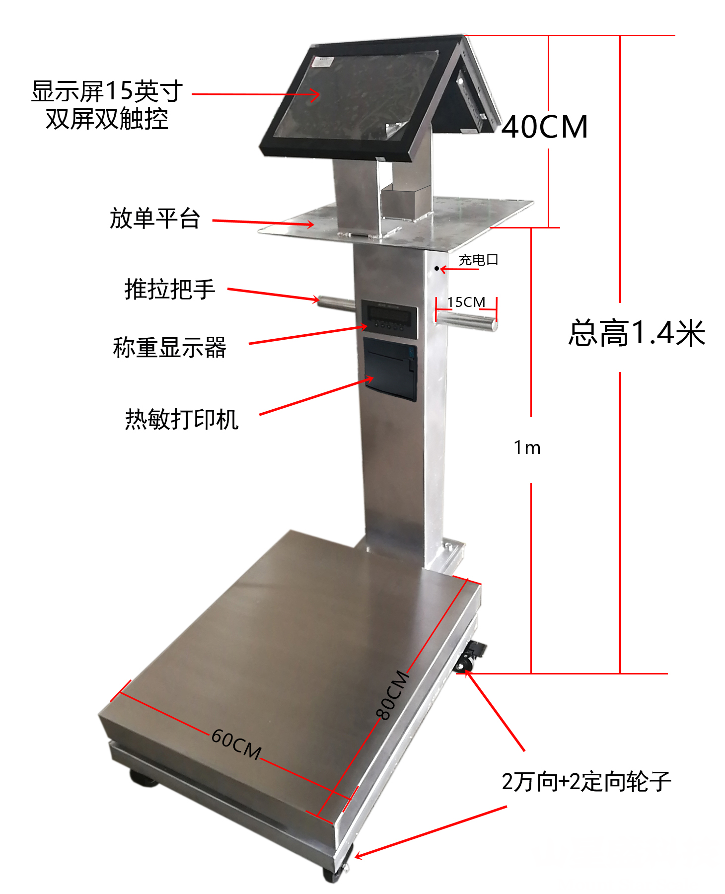 多功能一體電子秤是在電子秤的基礎上加裝多種選配件組裝成,由15寸雙觸膜顯示器+打印機+充存電+攝像頭+掃碼裝置等